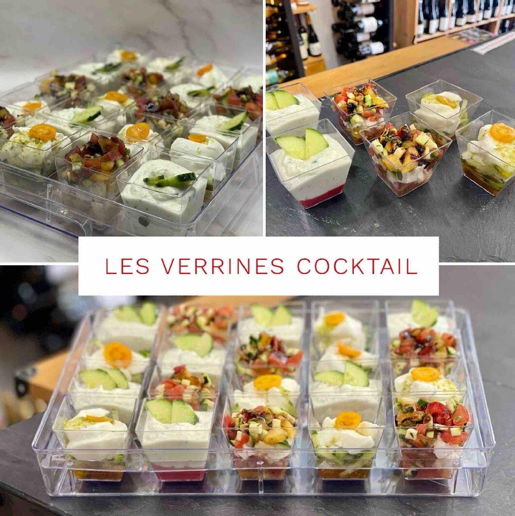 • Plateau de 20 verrines dînatoires (consignées à retourner ou jetables + 6€), 3 recettes variées: betteraves, cervelle de canut & concombre / concassé de tomates aux fines herbes & fêta / crème de légume, concombre & mozzarella au pesto
